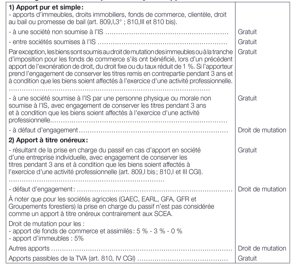 Pour l’apport pur et simple ou à titre onéreux fait à une personne morale passible de l’impôt sur les sociétés au cours du fonctionnement de celle-ci ou à titre onéreux (voir l’article 98).